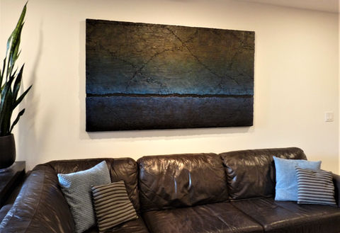 This 40" x 30" commission was recently installed for a Calgary office. The piece incorporated over 50 washes of cobalt blues, pthalo blues, yellow ochre, raw and burnt sienna.
