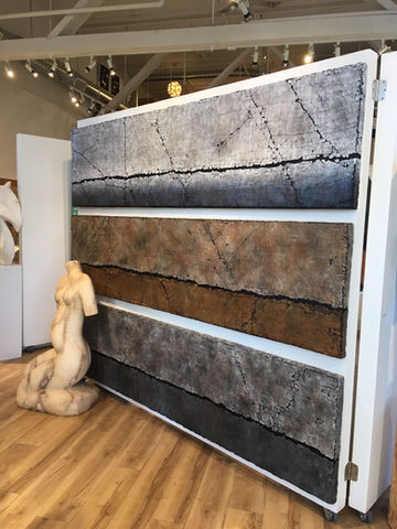 This 24" x 70" commission was recently installed for a Palm Springs home. The piece explores hues of Titanium white, pearlescent white, raw sienna, burnt umber and yellow ochre.